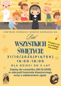 W piątek Centrum Formacji Rodzin zaprasza wszystkie dzieci na Bal Wszystkich Świętych. Zapisy oraz odbiór zgód i zaświadczeń w zakrystii kościoła klasztornego do czwartku. Udział możliwy od 3 roku życia.