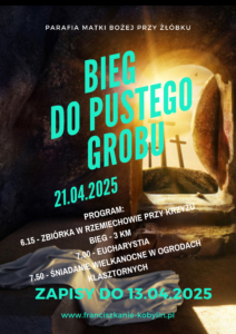 W poniedziałek wielkanocny 21.04 zapraszamy na Bieg do pustego Grobu. Wczesnym rankiem o 6.15 odczytamy przy krzyżu w Rzemiechowie fragment Ewangelii, jak św. Piotr i Jan pobiegli do grobu. Ujrzeli i uwierzyli. O 7.00 Eucharystia, po niej w ogrodach klasztornych śniadanie. Zapisy do przyszłej niedzieli.
