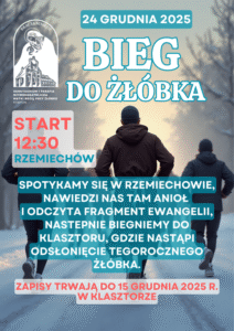 Bieg rozpocznie się w Rzemiechowie o godz. 12:30od odczytania fragmentu Ewangelii o Pasterzach. Następnie uczestnicy pobiegną trasę o długości 3 km.Uczestnicy jako pierwsi zobaczą Nowo Narodzonego Pana. Z tą nowiną będą mogli wrócić do swoich domów i zasiąść do wigilijnego stołu.Zapisy w zakrystii do niedzieli 21.12, z podaniem rozmiaru koszulki.Koszt udziału: 50 zł.