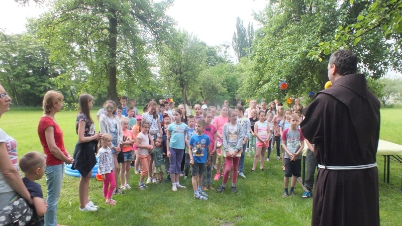 W sobotę 28 maja klasztorny ogród, jak co roku o tej porze, opanowały dzieci, które przybyły tu, aby świętować Dzień Dziecka. Prawie setka małych i większych dzieciaków, często z rodzicami, mamami, babciami przyszła na zaproszenie ojca gwardiana, aby bawić się, radować i wspólnie, w miłej atmosferze spędzić prawie letnie już przedpołudnie. Punktualnie o godzinie 10.00 po krótkiej modlitwie rozpoczęły się harce i swawole na łonie przyrody, na specjalnie dla dzieci przygotowanym ,,placu zabaw”. Słońce, otaczająca przyroda, wesoła muzyka i uśmiechnięty jak zawsze ojciec Masseo zachęcały wszystkich do dobrej zabawy. Każdy mógł tutaj znaleźć coś ciekawego dla siebie. Najmłodsi opanowali piaskownicę i basen z rybkami. Dużą atrakcją były wielkie bańki mydlane, które dzieci mogły zrobić same korzystając ze specjalnego sprzętu. Był kącik kulinarny, gdzie można było przygotować owocowe szaszłyki, a także punkt, który zapraszał na kreatywne zajęcia plastyczne. Tu, głównie dziewczynki wykonywały bransoletki, kotyliony, kolorowały ,,wielkie” kolorowanki. Chłopcy udali się na Franc Arenę, gdzie rozegrali mecz w piłkę nożną. Wielkim powodzeniem cieszyły się zabawy z chustą animacyjną i konkurencje sportowe, a także malowanie twarzy. Na festynie nie zabrakło dzielnych strażaków, którzy przygotowali dla naszych milusińskich ,, wodne’ zawody. Na głodnych i spragnionych czekały słodycze, chipsy, kolorowe desery, napoje oraz kiełbaski z grilla. Wspólna modlitwa i życzenia dla najmłodszych zakończyły Parafialny festyn z okazji ich święta. Serdeczne podziękowania dla wszystkich, którzy pomogli w organizacji i przebiegu imprezy. Ojcu Gwardianowi dziękujemy za muzykę i nagłośnienie imprezy, a ojcu Masseo, za przygotowanie i prowadzenie festynu.