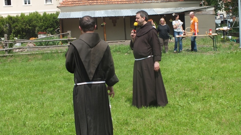 W sobotę 28 maja klasztorny ogród, jak co roku o tej porze, opanowały dzieci, które przybyły tu, aby świętować Dzień Dziecka. Prawie setka małych i większych dzieciaków, często z rodzicami, mamami, babciami przyszła na zaproszenie ojca gwardiana, aby bawić się, radować i wspólnie, w miłej atmosferze spędzić prawie letnie już przedpołudnie. Punktualnie o godzinie 10.00 po krótkiej modlitwie rozpoczęły się harce i swawole na łonie przyrody, na specjalnie dla dzieci przygotowanym ,,placu zabaw”. Słońce, otaczająca przyroda, wesoła muzyka i uśmiechnięty jak zawsze ojciec Masseo zachęcały wszystkich do dobrej zabawy. Każdy mógł tutaj znaleźć coś ciekawego dla siebie. Najmłodsi opanowali piaskownicę i basen z rybkami. Dużą atrakcją były wielkie bańki mydlane, które dzieci mogły zrobić same korzystając ze specjalnego sprzętu. Był kącik kulinarny, gdzie można było przygotować owocowe szaszłyki, a także punkt, który zapraszał na kreatywne zajęcia plastyczne. Tu, głównie dziewczynki wykonywały bransoletki, kotyliony, kolorowały ,,wielkie” kolorowanki. Chłopcy udali się na Franc Arenę, gdzie rozegrali mecz w piłkę nożną. Wielkim powodzeniem cieszyły się zabawy z chustą animacyjną i konkurencje sportowe, a także malowanie twarzy. Na festynie nie zabrakło dzielnych strażaków, którzy przygotowali dla naszych milusińskich ,, wodne’ zawody. Na głodnych i spragnionych czekały słodycze, chipsy, kolorowe desery, napoje oraz kiełbaski z grilla. Wspólna modlitwa i życzenia dla najmłodszych zakończyły Parafialny festyn z okazji ich święta. Serdeczne podziękowania dla wszystkich, którzy pomogli w organizacji i przebiegu imprezy. Ojcu Gwardianowi dziękujemy za muzykę i nagłośnienie imprezy, a ojcu Masseo, za przygotowanie i prowadzenie festynu.
