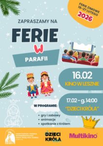 W dniach 16–17 lutego 2026 r. (poniedziałek–wtorek) zapraszamy dzieci na wspólne, parafialne ferie pełne radości, integracji i wartościowego czasu razem.