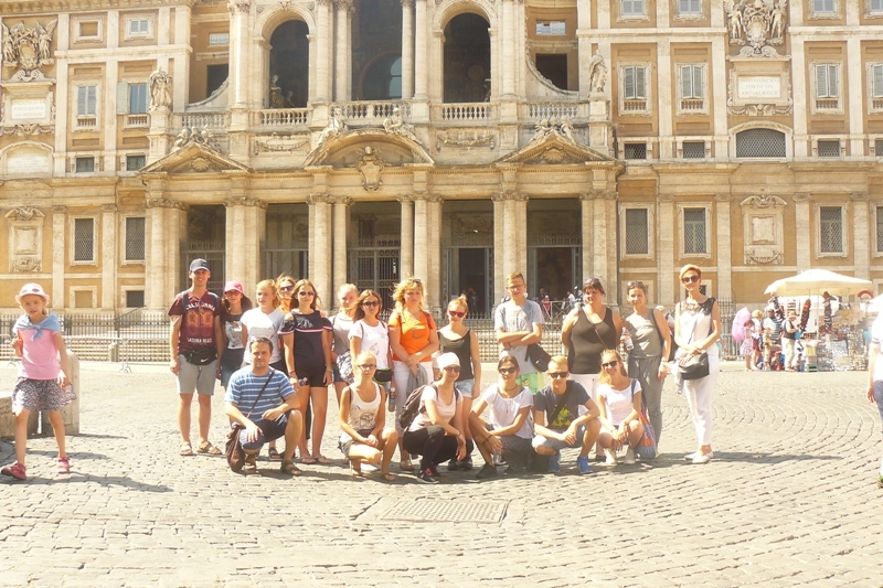 Zobaczyliśmy Bazylikę św. Jana Chrzciciela na Lateranie, która dawniej była miejscem rezydencji kolejnych papieży. Jest to jedna z tzw. Bazylik Większych. Tego dnia po krótkim odpoczynku pojechaliśmy nad Morze Tyrreńskie. W drodze powrotnej zatrzymaliśmy się przy Coloseum, które zrobiło na nas ogromne wrażenie. Wtorek był dla nas dniem szczególnym. Udaliśmy się na Watykan, na co czekaliśmy z ogromną niecierpliwością. W oknie ujrzeliśmy naszego Papieża Franciszka, zwiedzaliśmy Bazylikę Św. Piotra i uczestniczyliśmy we Mszy św. z Uroczystości Wniebowzięcia Najświętszej Maryi Panny. Oczywiście pomodliliśmy się nad grobem św. Jana Pawła II. Miejsce to napełniło nas wzruszeniem i zadumą. Wieczorem udaliśmy się na spacer po Rzymie, zobaczyliśmy Schody Hiszpańskie oraz barokową fontannę Di Trevi. Na zakończenie, po dniu pełnym wrażeń, udaliśmy się na pizzę, a w drodze powrotnej zwiedzaliśmy ruiny starego Miasta. W środę pojechaliśmy pociągiem do Asyżu, miasta świętych Franciszka i Klary. Zwiedziliśmy Bazylikę Najświętszej Maryi Panny od Aniołów, następnie niezapomniane Bazyliki św. Franciszka i św. Klary. Asyż to urzekające miasteczko, pełne zieleni, pięknych starych uliczek, miasteczko w którym można się zakochać. W ostatni dzień naszej podróży odwiedziliśmy Bazylikę Matki Bożej Większej (Matki Bożej Śnieżnej i co najważniejsze – od czasów, gdy znalazły się w niej relikwie żłóbka, Bazylika ta nosi także tytuł Matki Bożej przy Żłobku). Nie sposób było jej nie zwiedzić i oczywiście pomodlić się w intencji naszej parafii. Zwiedziliśmy także zamek św. Anioła, Plac Piazza Navonna, Capitol i wiele miejsc, których nie da się zapomnieć. Codziennie uczestniczyliśmy też w Mszy Świętej, odprawianej przez naszych Ojców Ksawerego i Masseo. Szczęśliwi wróciliśmy do Polski. Dla niektórych z nas była to podróż życia, niezapomnianych wrażeń, zadumy. Nie da się opisać wszystkiego co zobaczyliśmy i przeżyliśmy. Uczestniczka