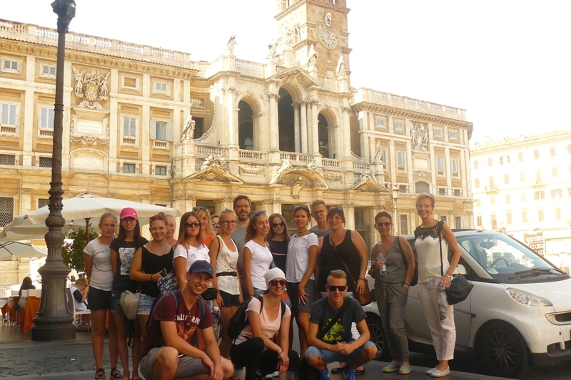 Zobaczyliśmy Bazylikę św. Jana Chrzciciela na Lateranie, która dawniej była miejscem rezydencji kolejnych papieży. Jest to jedna z tzw. Bazylik Większych. Tego dnia po krótkim odpoczynku pojechaliśmy nad Morze Tyrreńskie. W drodze powrotnej zatrzymaliśmy się przy Coloseum, które zrobiło na nas ogromne wrażenie. Wtorek był dla nas dniem szczególnym. Udaliśmy się na Watykan, na co czekaliśmy z ogromną niecierpliwością. W oknie ujrzeliśmy naszego Papieża Franciszka, zwiedzaliśmy Bazylikę Św. Piotra i uczestniczyliśmy we Mszy św. z Uroczystości Wniebowzięcia Najświętszej Maryi Panny. Oczywiście pomodliliśmy się nad grobem św. Jana Pawła II. Miejsce to napełniło nas wzruszeniem i zadumą. Wieczorem udaliśmy się na spacer po Rzymie, zobaczyliśmy Schody Hiszpańskie oraz barokową fontannę Di Trevi. Na zakończenie, po dniu pełnym wrażeń, udaliśmy się na pizzę, a w drodze powrotnej zwiedzaliśmy ruiny starego Miasta. W środę pojechaliśmy pociągiem do Asyżu, miasta świętych Franciszka i Klary. Zwiedziliśmy Bazylikę Najświętszej Maryi Panny od Aniołów, następnie niezapomniane Bazyliki św. Franciszka i św. Klary. Asyż to urzekające miasteczko, pełne zieleni, pięknych starych uliczek, miasteczko w którym można się zakochać. W ostatni dzień naszej podróży odwiedziliśmy Bazylikę Matki Bożej Większej (Matki Bożej Śnieżnej i co najważniejsze – od czasów, gdy znalazły się w niej relikwie żłóbka, Bazylika ta nosi także tytuł Matki Bożej przy Żłobku). Nie sposób było jej nie zwiedzić i oczywiście pomodlić się w intencji naszej parafii. Zwiedziliśmy także zamek św. Anioła, Plac Piazza Navonna, Capitol i wiele miejsc, których nie da się zapomnieć. Codziennie uczestniczyliśmy też w Mszy Świętej, odprawianej przez naszych Ojców Ksawerego i Masseo. Szczęśliwi wróciliśmy do Polski. Dla niektórych z nas była to podróż życia, niezapomnianych wrażeń, zadumy. Nie da się opisać wszystkiego co zobaczyliśmy i przeżyliśmy. Uczestniczka