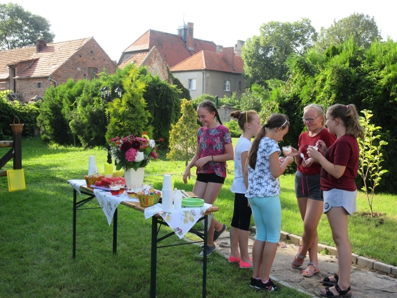 Po powrocie i rozstrzygnięciu zabawy, wszyscy udali się do salki św. Klary gdzie obejrzeli krótką bajkę przedstawiającą najważniejsze fakty z życia Świętej. Dzieci musiały z uwagą oglądać filmik, ponieważ informacje o życiu św. Klary potrzebne były w następnych zadaniach. Po projekcji przyszedł czas na kolację, na pyszną grillowana kiełbaskę. Gdy dzieci najadły się i nakarmiły koty wzięły udział w quizie o życiu św. Klary. Uczestnicy zabawili się w wędkarzy i z małego basenu musieli w ciągu 30 sekund wyłowić rybkę z pytaniem dotyczącym głównej bohaterki spotkania. Drużyny były dobrze przygotowane i miały dużą wiedzę na temat życia św. Klary. Gdy w ogrodzie zapadł zmierzch, a w klasztorze zapanowała głęboka cisza wszyscy przeszli do klasztornego refektarza na zajęcia plastyczne. Dzieci zdobiły świece. I to nie był przypadek, świeca bowiem daje światło, rozjaśnia otoczenie, w świetle dostrzegamy wiele rzeczy, często widzimy je w innym wymiarze. Imię Klara oznacza blask, jasność, światło, które ma przypominać, że i my jako chrześcijanie mamy być światłością, podobnie jak była nią św. Klara. Ona jest jasnym przykładem jak zdecydowanie iść za Jezusem, jasnym świadectwem oddania i miłości do Boga dla ludzi żyjących w dzisiejszym świecie. W nocy ok 24.00 ogłoszono pobudkę, wszyscy uczestnicy spotkania z zapalonymi świecami przeszli ciemnymi klasztornymi korytarzami do kościoła. Na ołtarzu św. Franciszka została przygotowana dekoracja ku czci św. Klary. Dzieci odmówiły wspólnie modlitwę o łaskę stania się światłem dla innych i zostawiły ozdobione przez siebie świece przy wizerunku św. Klary. Po nocy pełnej wrażeń nastał słoneczny poranek. Choć niektórym ciężko było wstać, wszyscy wzięli udział w Eucharystii, którą szczególnie umiłowała św. Klara. Ostatnim punktem spotkania było świąteczne śniadanie w klasztornym ogrodzie, po którym podsumowano wspólnie spędzony czas. Bardzo serdecznie dziękujemy Parafialnemu Zespołowi Charytatywnemu za przygotowanie i poprowadzenie tego szczególnego spotkania. Niech św. Klara wyprasza nam wszystkim potrzebne łaski u Pana.