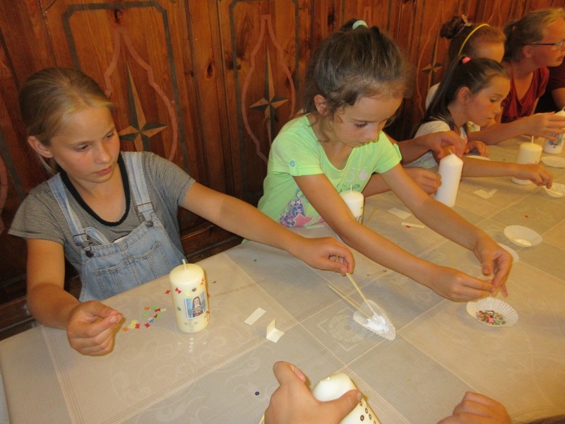 Po powrocie i rozstrzygnięciu zabawy, wszyscy udali się do salki św. Klary gdzie obejrzeli krótką bajkę przedstawiającą najważniejsze fakty z życia Świętej. Dzieci musiały z uwagą oglądać filmik, ponieważ informacje o życiu św. Klary potrzebne były w następnych zadaniach. Po projekcji przyszedł czas na kolację, na pyszną grillowana kiełbaskę. Gdy dzieci najadły się i nakarmiły koty wzięły udział w quizie o życiu św. Klary. Uczestnicy zabawili się w wędkarzy i z małego basenu musieli w ciągu 30 sekund wyłowić rybkę z pytaniem dotyczącym głównej bohaterki spotkania. Drużyny były dobrze przygotowane i miały dużą wiedzę na temat życia św. Klary. Gdy w ogrodzie zapadł zmierzch, a w klasztorze zapanowała głęboka cisza wszyscy przeszli do klasztornego refektarza na zajęcia plastyczne. Dzieci zdobiły świece. I to nie był przypadek, świeca bowiem daje światło, rozjaśnia otoczenie, w świetle dostrzegamy wiele rzeczy, często widzimy je w innym wymiarze. Imię Klara oznacza blask, jasność, światło, które ma przypominać, że i my jako chrześcijanie mamy być światłością, podobnie jak była nią św. Klara. Ona jest jasnym przykładem jak zdecydowanie iść za Jezusem, jasnym świadectwem oddania i miłości do Boga dla ludzi żyjących w dzisiejszym świecie. W nocy ok 24.00 ogłoszono pobudkę, wszyscy uczestnicy spotkania z zapalonymi świecami przeszli ciemnymi klasztornymi korytarzami do kościoła. Na ołtarzu św. Franciszka została przygotowana dekoracja ku czci św. Klary. Dzieci odmówiły wspólnie modlitwę o łaskę stania się światłem dla innych i zostawiły ozdobione przez siebie świece przy wizerunku św. Klary. Po nocy pełnej wrażeń nastał słoneczny poranek. Choć niektórym ciężko było wstać, wszyscy wzięli udział w Eucharystii, którą szczególnie umiłowała św. Klara. Ostatnim punktem spotkania było świąteczne śniadanie w klasztornym ogrodzie, po którym podsumowano wspólnie spędzony czas. Bardzo serdecznie dziękujemy Parafialnemu Zespołowi Charytatywnemu za przygotowanie i poprowadzenie tego szczególnego spotkania. Niech św. Klara wyprasza nam wszystkim potrzebne łaski u Pana.