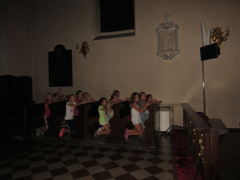 Po powrocie i rozstrzygnięciu zabawy, wszyscy udali się do salki św. Klary gdzie obejrzeli krótką bajkę przedstawiającą najważniejsze fakty z życia Świętej. Dzieci musiały z uwagą oglądać filmik, ponieważ informacje o życiu św. Klary potrzebne były w następnych zadaniach. Po projekcji przyszedł czas na kolację, na pyszną grillowana kiełbaskę. Gdy dzieci najadły się i nakarmiły koty wzięły udział w quizie o życiu św. Klary. Uczestnicy zabawili się w wędkarzy i z małego basenu musieli w ciągu 30 sekund wyłowić rybkę z pytaniem dotyczącym głównej bohaterki spotkania. Drużyny były dobrze przygotowane i miały dużą wiedzę na temat życia św. Klary. Gdy w ogrodzie zapadł zmierzch, a w klasztorze zapanowała głęboka cisza wszyscy przeszli do klasztornego refektarza na zajęcia plastyczne. Dzieci zdobiły świece. I to nie był przypadek, świeca bowiem daje światło, rozjaśnia otoczenie, w świetle dostrzegamy wiele rzeczy, często widzimy je w innym wymiarze. Imię Klara oznacza blask, jasność, światło, które ma przypominać, że i my jako chrześcijanie mamy być światłością, podobnie jak była nią św. Klara. Ona jest jasnym przykładem jak zdecydowanie iść za Jezusem, jasnym świadectwem oddania i miłości do Boga dla ludzi żyjących w dzisiejszym świecie. W nocy ok 24.00 ogłoszono pobudkę, wszyscy uczestnicy spotkania z zapalonymi świecami przeszli ciemnymi klasztornymi korytarzami do kościoła. Na ołtarzu św. Franciszka została przygotowana dekoracja ku czci św. Klary. Dzieci odmówiły wspólnie modlitwę o łaskę stania się światłem dla innych i zostawiły ozdobione przez siebie świece przy wizerunku św. Klary. Po nocy pełnej wrażeń nastał słoneczny poranek. Choć niektórym ciężko było wstać, wszyscy wzięli udział w Eucharystii, którą szczególnie umiłowała św. Klara. Ostatnim punktem spotkania było świąteczne śniadanie w klasztornym ogrodzie, po którym podsumowano wspólnie spędzony czas. Bardzo serdecznie dziękujemy Parafialnemu Zespołowi Charytatywnemu za przygotowanie i poprowadzenie tego szczególnego spotkania. Niech św. Klara wyprasza nam wszystkim potrzebne łaski u Pana.