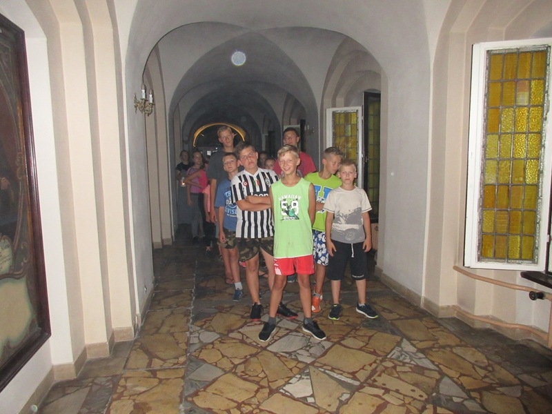 Po powrocie i rozstrzygnięciu zabawy, wszyscy udali się do salki św. Klary gdzie obejrzeli krótką bajkę przedstawiającą najważniejsze fakty z życia Świętej. Dzieci musiały z uwagą oglądać filmik, ponieważ informacje o życiu św. Klary potrzebne były w następnych zadaniach. Po projekcji przyszedł czas na kolację, na pyszną grillowana kiełbaskę. Gdy dzieci najadły się i nakarmiły koty wzięły udział w quizie o życiu św. Klary. Uczestnicy zabawili się w wędkarzy i z małego basenu musieli w ciągu 30 sekund wyłowić rybkę z pytaniem dotyczącym głównej bohaterki spotkania. Drużyny były dobrze przygotowane i miały dużą wiedzę na temat życia św. Klary. Gdy w ogrodzie zapadł zmierzch, a w klasztorze zapanowała głęboka cisza wszyscy przeszli do klasztornego refektarza na zajęcia plastyczne. Dzieci zdobiły świece. I to nie był przypadek, świeca bowiem daje światło, rozjaśnia otoczenie, w świetle dostrzegamy wiele rzeczy, często widzimy je w innym wymiarze. Imię Klara oznacza blask, jasność, światło, które ma przypominać, że i my jako chrześcijanie mamy być światłością, podobnie jak była nią św. Klara. Ona jest jasnym przykładem jak zdecydowanie iść za Jezusem, jasnym świadectwem oddania i miłości do Boga dla ludzi żyjących w dzisiejszym świecie. W nocy ok 24.00 ogłoszono pobudkę, wszyscy uczestnicy spotkania z zapalonymi świecami przeszli ciemnymi klasztornymi korytarzami do kościoła. Na ołtarzu św. Franciszka została przygotowana dekoracja ku czci św. Klary. Dzieci odmówiły wspólnie modlitwę o łaskę stania się światłem dla innych i zostawiły ozdobione przez siebie świece przy wizerunku św. Klary. Po nocy pełnej wrażeń nastał słoneczny poranek. Choć niektórym ciężko było wstać, wszyscy wzięli udział w Eucharystii, którą szczególnie umiłowała św. Klara. Ostatnim punktem spotkania było świąteczne śniadanie w klasztornym ogrodzie, po którym podsumowano wspólnie spędzony czas. Bardzo serdecznie dziękujemy Parafialnemu Zespołowi Charytatywnemu za przygotowanie i poprowadzenie tego szczególnego spotkania. Niech św. Klara wyprasza nam wszystkim potrzebne łaski u Pana.
