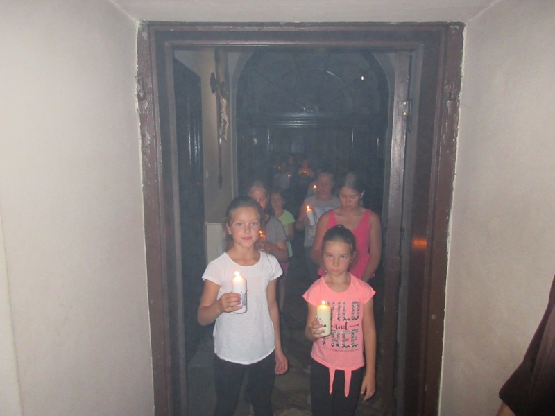 Po powrocie i rozstrzygnięciu zabawy, wszyscy udali się do salki św. Klary gdzie obejrzeli krótką bajkę przedstawiającą najważniejsze fakty z życia Świętej. Dzieci musiały z uwagą oglądać filmik, ponieważ informacje o życiu św. Klary potrzebne były w następnych zadaniach. Po projekcji przyszedł czas na kolację, na pyszną grillowana kiełbaskę. Gdy dzieci najadły się i nakarmiły koty wzięły udział w quizie o życiu św. Klary. Uczestnicy zabawili się w wędkarzy i z małego basenu musieli w ciągu 30 sekund wyłowić rybkę z pytaniem dotyczącym głównej bohaterki spotkania. Drużyny były dobrze przygotowane i miały dużą wiedzę na temat życia św. Klary. Gdy w ogrodzie zapadł zmierzch, a w klasztorze zapanowała głęboka cisza wszyscy przeszli do klasztornego refektarza na zajęcia plastyczne. Dzieci zdobiły świece. I to nie był przypadek, świeca bowiem daje światło, rozjaśnia otoczenie, w świetle dostrzegamy wiele rzeczy, często widzimy je w innym wymiarze. Imię Klara oznacza blask, jasność, światło, które ma przypominać, że i my jako chrześcijanie mamy być światłością, podobnie jak była nią św. Klara. Ona jest jasnym przykładem jak zdecydowanie iść za Jezusem, jasnym świadectwem oddania i miłości do Boga dla ludzi żyjących w dzisiejszym świecie. W nocy ok 24.00 ogłoszono pobudkę, wszyscy uczestnicy spotkania z zapalonymi świecami przeszli ciemnymi klasztornymi korytarzami do kościoła. Na ołtarzu św. Franciszka została przygotowana dekoracja ku czci św. Klary. Dzieci odmówiły wspólnie modlitwę o łaskę stania się światłem dla innych i zostawiły ozdobione przez siebie świece przy wizerunku św. Klary. Po nocy pełnej wrażeń nastał słoneczny poranek. Choć niektórym ciężko było wstać, wszyscy wzięli udział w Eucharystii, którą szczególnie umiłowała św. Klara. Ostatnim punktem spotkania było świąteczne śniadanie w klasztornym ogrodzie, po którym podsumowano wspólnie spędzony czas. Bardzo serdecznie dziękujemy Parafialnemu Zespołowi Charytatywnemu za przygotowanie i poprowadzenie tego szczególnego spotkania. Niech św. Klara wyprasza nam wszystkim potrzebne łaski u Pana.