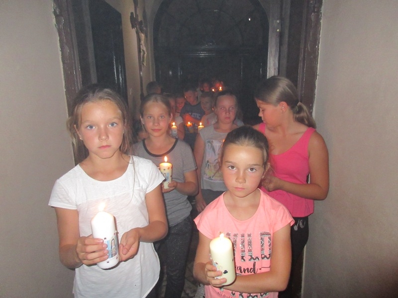 Po powrocie i rozstrzygnięciu zabawy, wszyscy udali się do salki św. Klary gdzie obejrzeli krótką bajkę przedstawiającą najważniejsze fakty z życia Świętej. Dzieci musiały z uwagą oglądać filmik, ponieważ informacje o życiu św. Klary potrzebne były w następnych zadaniach. Po projekcji przyszedł czas na kolację, na pyszną grillowana kiełbaskę. Gdy dzieci najadły się i nakarmiły koty wzięły udział w quizie o życiu św. Klary. Uczestnicy zabawili się w wędkarzy i z małego basenu musieli w ciągu 30 sekund wyłowić rybkę z pytaniem dotyczącym głównej bohaterki spotkania. Drużyny były dobrze przygotowane i miały dużą wiedzę na temat życia św. Klary. Gdy w ogrodzie zapadł zmierzch, a w klasztorze zapanowała głęboka cisza wszyscy przeszli do klasztornego refektarza na zajęcia plastyczne. Dzieci zdobiły świece. I to nie był przypadek, świeca bowiem daje światło, rozjaśnia otoczenie, w świetle dostrzegamy wiele rzeczy, często widzimy je w innym wymiarze. Imię Klara oznacza blask, jasność, światło, które ma przypominać, że i my jako chrześcijanie mamy być światłością, podobnie jak była nią św. Klara. Ona jest jasnym przykładem jak zdecydowanie iść za Jezusem, jasnym świadectwem oddania i miłości do Boga dla ludzi żyjących w dzisiejszym świecie. W nocy ok 24.00 ogłoszono pobudkę, wszyscy uczestnicy spotkania z zapalonymi świecami przeszli ciemnymi klasztornymi korytarzami do kościoła. Na ołtarzu św. Franciszka została przygotowana dekoracja ku czci św. Klary. Dzieci odmówiły wspólnie modlitwę o łaskę stania się światłem dla innych i zostawiły ozdobione przez siebie świece przy wizerunku św. Klary. Po nocy pełnej wrażeń nastał słoneczny poranek. Choć niektórym ciężko było wstać, wszyscy wzięli udział w Eucharystii, którą szczególnie umiłowała św. Klara. Ostatnim punktem spotkania było świąteczne śniadanie w klasztornym ogrodzie, po którym podsumowano wspólnie spędzony czas. Bardzo serdecznie dziękujemy Parafialnemu Zespołowi Charytatywnemu za przygotowanie i poprowadzenie tego szczególnego spotkania. Niech św. Klara wyprasza nam wszystkim potrzebne łaski u Pana.