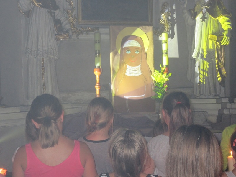 Po powrocie i rozstrzygnięciu zabawy, wszyscy udali się do salki św. Klary gdzie obejrzeli krótką bajkę przedstawiającą najważniejsze fakty z życia Świętej. Dzieci musiały z uwagą oglądać filmik, ponieważ informacje o życiu św. Klary potrzebne były w następnych zadaniach. Po projekcji przyszedł czas na kolację, na pyszną grillowana kiełbaskę. Gdy dzieci najadły się i nakarmiły koty wzięły udział w quizie o życiu św. Klary. Uczestnicy zabawili się w wędkarzy i z małego basenu musieli w ciągu 30 sekund wyłowić rybkę z pytaniem dotyczącym głównej bohaterki spotkania. Drużyny były dobrze przygotowane i miały dużą wiedzę na temat życia św. Klary. Gdy w ogrodzie zapadł zmierzch, a w klasztorze zapanowała głęboka cisza wszyscy przeszli do klasztornego refektarza na zajęcia plastyczne. Dzieci zdobiły świece. I to nie był przypadek, świeca bowiem daje światło, rozjaśnia otoczenie, w świetle dostrzegamy wiele rzeczy, często widzimy je w innym wymiarze. Imię Klara oznacza blask, jasność, światło, które ma przypominać, że i my jako chrześcijanie mamy być światłością, podobnie jak była nią św. Klara. Ona jest jasnym przykładem jak zdecydowanie iść za Jezusem, jasnym świadectwem oddania i miłości do Boga dla ludzi żyjących w dzisiejszym świecie. W nocy ok 24.00 ogłoszono pobudkę, wszyscy uczestnicy spotkania z zapalonymi świecami przeszli ciemnymi klasztornymi korytarzami do kościoła. Na ołtarzu św. Franciszka została przygotowana dekoracja ku czci św. Klary. Dzieci odmówiły wspólnie modlitwę o łaskę stania się światłem dla innych i zostawiły ozdobione przez siebie świece przy wizerunku św. Klary. Po nocy pełnej wrażeń nastał słoneczny poranek. Choć niektórym ciężko było wstać, wszyscy wzięli udział w Eucharystii, którą szczególnie umiłowała św. Klara. Ostatnim punktem spotkania było świąteczne śniadanie w klasztornym ogrodzie, po którym podsumowano wspólnie spędzony czas. Bardzo serdecznie dziękujemy Parafialnemu Zespołowi Charytatywnemu za przygotowanie i poprowadzenie tego szczególnego spotkania. Niech św. Klara wyprasza nam wszystkim potrzebne łaski u Pana.