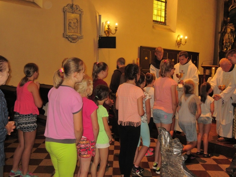Po powrocie i rozstrzygnięciu zabawy, wszyscy udali się do salki św. Klary gdzie obejrzeli krótką bajkę przedstawiającą najważniejsze fakty z życia Świętej. Dzieci musiały z uwagą oglądać filmik, ponieważ informacje o życiu św. Klary potrzebne były w następnych zadaniach. Po projekcji przyszedł czas na kolację, na pyszną grillowana kiełbaskę. Gdy dzieci najadły się i nakarmiły koty wzięły udział w quizie o życiu św. Klary. Uczestnicy zabawili się w wędkarzy i z małego basenu musieli w ciągu 30 sekund wyłowić rybkę z pytaniem dotyczącym głównej bohaterki spotkania. Drużyny były dobrze przygotowane i miały dużą wiedzę na temat życia św. Klary. Gdy w ogrodzie zapadł zmierzch, a w klasztorze zapanowała głęboka cisza wszyscy przeszli do klasztornego refektarza na zajęcia plastyczne. Dzieci zdobiły świece. I to nie był przypadek, świeca bowiem daje światło, rozjaśnia otoczenie, w świetle dostrzegamy wiele rzeczy, często widzimy je w innym wymiarze. Imię Klara oznacza blask, jasność, światło, które ma przypominać, że i my jako chrześcijanie mamy być światłością, podobnie jak była nią św. Klara. Ona jest jasnym przykładem jak zdecydowanie iść za Jezusem, jasnym świadectwem oddania i miłości do Boga dla ludzi żyjących w dzisiejszym świecie. W nocy ok 24.00 ogłoszono pobudkę, wszyscy uczestnicy spotkania z zapalonymi świecami przeszli ciemnymi klasztornymi korytarzami do kościoła. Na ołtarzu św. Franciszka została przygotowana dekoracja ku czci św. Klary. Dzieci odmówiły wspólnie modlitwę o łaskę stania się światłem dla innych i zostawiły ozdobione przez siebie świece przy wizerunku św. Klary. Po nocy pełnej wrażeń nastał słoneczny poranek. Choć niektórym ciężko było wstać, wszyscy wzięli udział w Eucharystii, którą szczególnie umiłowała św. Klara. Ostatnim punktem spotkania było świąteczne śniadanie w klasztornym ogrodzie, po którym podsumowano wspólnie spędzony czas. Bardzo serdecznie dziękujemy Parafialnemu Zespołowi Charytatywnemu za przygotowanie i poprowadzenie tego szczególnego spotkania. Niech św. Klara wyprasza nam wszystkim potrzebne łaski u Pana.