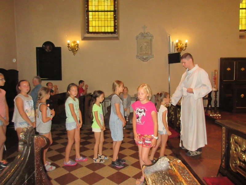 Po powrocie i rozstrzygnięciu zabawy, wszyscy udali się do salki św. Klary gdzie obejrzeli krótką bajkę przedstawiającą najważniejsze fakty z życia Świętej. Dzieci musiały z uwagą oglądać filmik, ponieważ informacje o życiu św. Klary potrzebne były w następnych zadaniach. Po projekcji przyszedł czas na kolację, na pyszną grillowana kiełbaskę. Gdy dzieci najadły się i nakarmiły koty wzięły udział w quizie o życiu św. Klary. Uczestnicy zabawili się w wędkarzy i z małego basenu musieli w ciągu 30 sekund wyłowić rybkę z pytaniem dotyczącym głównej bohaterki spotkania. Drużyny były dobrze przygotowane i miały dużą wiedzę na temat życia św. Klary. Gdy w ogrodzie zapadł zmierzch, a w klasztorze zapanowała głęboka cisza wszyscy przeszli do klasztornego refektarza na zajęcia plastyczne. Dzieci zdobiły świece. I to nie był przypadek, świeca bowiem daje światło, rozjaśnia otoczenie, w świetle dostrzegamy wiele rzeczy, często widzimy je w innym wymiarze. Imię Klara oznacza blask, jasność, światło, które ma przypominać, że i my jako chrześcijanie mamy być światłością, podobnie jak była nią św. Klara. Ona jest jasnym przykładem jak zdecydowanie iść za Jezusem, jasnym świadectwem oddania i miłości do Boga dla ludzi żyjących w dzisiejszym świecie. W nocy ok 24.00 ogłoszono pobudkę, wszyscy uczestnicy spotkania z zapalonymi świecami przeszli ciemnymi klasztornymi korytarzami do kościoła. Na ołtarzu św. Franciszka została przygotowana dekoracja ku czci św. Klary. Dzieci odmówiły wspólnie modlitwę o łaskę stania się światłem dla innych i zostawiły ozdobione przez siebie świece przy wizerunku św. Klary. Po nocy pełnej wrażeń nastał słoneczny poranek. Choć niektórym ciężko było wstać, wszyscy wzięli udział w Eucharystii, którą szczególnie umiłowała św. Klara. Ostatnim punktem spotkania było świąteczne śniadanie w klasztornym ogrodzie, po którym podsumowano wspólnie spędzony czas. Bardzo serdecznie dziękujemy Parafialnemu Zespołowi Charytatywnemu za przygotowanie i poprowadzenie tego szczególnego spotkania. Niech św. Klara wyprasza nam wszystkim potrzebne łaski u Pana.