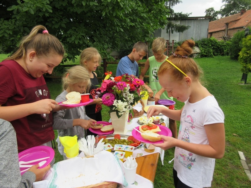 Po powrocie i rozstrzygnięciu zabawy, wszyscy udali się do salki św. Klary gdzie obejrzeli krótką bajkę przedstawiającą najważniejsze fakty z życia Świętej. Dzieci musiały z uwagą oglądać filmik, ponieważ informacje o życiu św. Klary potrzebne były w następnych zadaniach. Po projekcji przyszedł czas na kolację, na pyszną grillowana kiełbaskę. Gdy dzieci najadły się i nakarmiły koty wzięły udział w quizie o życiu św. Klary. Uczestnicy zabawili się w wędkarzy i z małego basenu musieli w ciągu 30 sekund wyłowić rybkę z pytaniem dotyczącym głównej bohaterki spotkania. Drużyny były dobrze przygotowane i miały dużą wiedzę na temat życia św. Klary. Gdy w ogrodzie zapadł zmierzch, a w klasztorze zapanowała głęboka cisza wszyscy przeszli do klasztornego refektarza na zajęcia plastyczne. Dzieci zdobiły świece. I to nie był przypadek, świeca bowiem daje światło, rozjaśnia otoczenie, w świetle dostrzegamy wiele rzeczy, często widzimy je w innym wymiarze. Imię Klara oznacza blask, jasność, światło, które ma przypominać, że i my jako chrześcijanie mamy być światłością, podobnie jak była nią św. Klara. Ona jest jasnym przykładem jak zdecydowanie iść za Jezusem, jasnym świadectwem oddania i miłości do Boga dla ludzi żyjących w dzisiejszym świecie. W nocy ok 24.00 ogłoszono pobudkę, wszyscy uczestnicy spotkania z zapalonymi świecami przeszli ciemnymi klasztornymi korytarzami do kościoła. Na ołtarzu św. Franciszka została przygotowana dekoracja ku czci św. Klary. Dzieci odmówiły wspólnie modlitwę o łaskę stania się światłem dla innych i zostawiły ozdobione przez siebie świece przy wizerunku św. Klary. Po nocy pełnej wrażeń nastał słoneczny poranek. Choć niektórym ciężko było wstać, wszyscy wzięli udział w Eucharystii, którą szczególnie umiłowała św. Klara. Ostatnim punktem spotkania było świąteczne śniadanie w klasztornym ogrodzie, po którym podsumowano wspólnie spędzony czas. Bardzo serdecznie dziękujemy Parafialnemu Zespołowi Charytatywnemu za przygotowanie i poprowadzenie tego szczególnego spotkania. Niech św. Klara wyprasza nam wszystkim potrzebne łaski u Pana.