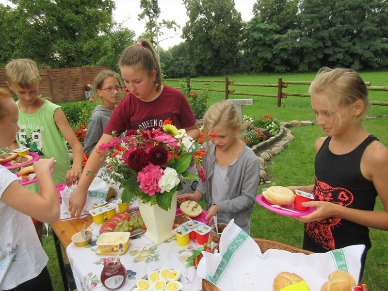 Po powrocie i rozstrzygnięciu zabawy, wszyscy udali się do salki św. Klary gdzie obejrzeli krótką bajkę przedstawiającą najważniejsze fakty z życia Świętej. Dzieci musiały z uwagą oglądać filmik, ponieważ informacje o życiu św. Klary potrzebne były w następnych zadaniach. Po projekcji przyszedł czas na kolację, na pyszną grillowana kiełbaskę. Gdy dzieci najadły się i nakarmiły koty wzięły udział w quizie o życiu św. Klary. Uczestnicy zabawili się w wędkarzy i z małego basenu musieli w ciągu 30 sekund wyłowić rybkę z pytaniem dotyczącym głównej bohaterki spotkania. Drużyny były dobrze przygotowane i miały dużą wiedzę na temat życia św. Klary. Gdy w ogrodzie zapadł zmierzch, a w klasztorze zapanowała głęboka cisza wszyscy przeszli do klasztornego refektarza na zajęcia plastyczne. Dzieci zdobiły świece. I to nie był przypadek, świeca bowiem daje światło, rozjaśnia otoczenie, w świetle dostrzegamy wiele rzeczy, często widzimy je w innym wymiarze. Imię Klara oznacza blask, jasność, światło, które ma przypominać, że i my jako chrześcijanie mamy być światłością, podobnie jak była nią św. Klara. Ona jest jasnym przykładem jak zdecydowanie iść za Jezusem, jasnym świadectwem oddania i miłości do Boga dla ludzi żyjących w dzisiejszym świecie. W nocy ok 24.00 ogłoszono pobudkę, wszyscy uczestnicy spotkania z zapalonymi świecami przeszli ciemnymi klasztornymi korytarzami do kościoła. Na ołtarzu św. Franciszka została przygotowana dekoracja ku czci św. Klary. Dzieci odmówiły wspólnie modlitwę o łaskę stania się światłem dla innych i zostawiły ozdobione przez siebie świece przy wizerunku św. Klary. Po nocy pełnej wrażeń nastał słoneczny poranek. Choć niektórym ciężko było wstać, wszyscy wzięli udział w Eucharystii, którą szczególnie umiłowała św. Klara. Ostatnim punktem spotkania było świąteczne śniadanie w klasztornym ogrodzie, po którym podsumowano wspólnie spędzony czas. Bardzo serdecznie dziękujemy Parafialnemu Zespołowi Charytatywnemu za przygotowanie i poprowadzenie tego szczególnego spotkania. Niech św. Klara wyprasza nam wszystkim potrzebne łaski u Pana.