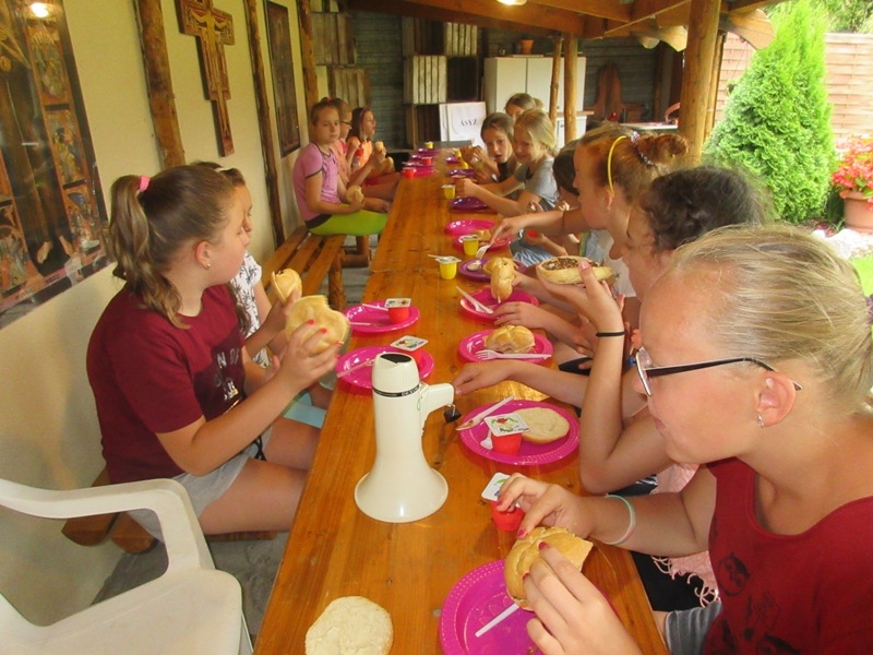 Po powrocie i rozstrzygnięciu zabawy, wszyscy udali się do salki św. Klary gdzie obejrzeli krótką bajkę przedstawiającą najważniejsze fakty z życia Świętej. Dzieci musiały z uwagą oglądać filmik, ponieważ informacje o życiu św. Klary potrzebne były w następnych zadaniach. Po projekcji przyszedł czas na kolację, na pyszną grillowana kiełbaskę. Gdy dzieci najadły się i nakarmiły koty wzięły udział w quizie o życiu św. Klary. Uczestnicy zabawili się w wędkarzy i z małego basenu musieli w ciągu 30 sekund wyłowić rybkę z pytaniem dotyczącym głównej bohaterki spotkania. Drużyny były dobrze przygotowane i miały dużą wiedzę na temat życia św. Klary. Gdy w ogrodzie zapadł zmierzch, a w klasztorze zapanowała głęboka cisza wszyscy przeszli do klasztornego refektarza na zajęcia plastyczne. Dzieci zdobiły świece. I to nie był przypadek, świeca bowiem daje światło, rozjaśnia otoczenie, w świetle dostrzegamy wiele rzeczy, często widzimy je w innym wymiarze. Imię Klara oznacza blask, jasność, światło, które ma przypominać, że i my jako chrześcijanie mamy być światłością, podobnie jak była nią św. Klara. Ona jest jasnym przykładem jak zdecydowanie iść za Jezusem, jasnym świadectwem oddania i miłości do Boga dla ludzi żyjących w dzisiejszym świecie. W nocy ok 24.00 ogłoszono pobudkę, wszyscy uczestnicy spotkania z zapalonymi świecami przeszli ciemnymi klasztornymi korytarzami do kościoła. Na ołtarzu św. Franciszka została przygotowana dekoracja ku czci św. Klary. Dzieci odmówiły wspólnie modlitwę o łaskę stania się światłem dla innych i zostawiły ozdobione przez siebie świece przy wizerunku św. Klary. Po nocy pełnej wrażeń nastał słoneczny poranek. Choć niektórym ciężko było wstać, wszyscy wzięli udział w Eucharystii, którą szczególnie umiłowała św. Klara. Ostatnim punktem spotkania było świąteczne śniadanie w klasztornym ogrodzie, po którym podsumowano wspólnie spędzony czas. Bardzo serdecznie dziękujemy Parafialnemu Zespołowi Charytatywnemu za przygotowanie i poprowadzenie tego szczególnego spotkania. Niech św. Klara wyprasza nam wszystkim potrzebne łaski u Pana.