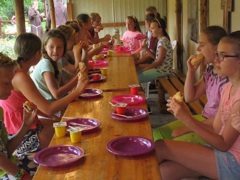 Po powrocie i rozstrzygnięciu zabawy, wszyscy udali się do salki św. Klary gdzie obejrzeli krótką bajkę przedstawiającą najważniejsze fakty z życia Świętej. Dzieci musiały z uwagą oglądać filmik, ponieważ informacje o życiu św. Klary potrzebne były w następnych zadaniach. Po projekcji przyszedł czas na kolację, na pyszną grillowana kiełbaskę. Gdy dzieci najadły się i nakarmiły koty wzięły udział w quizie o życiu św. Klary. Uczestnicy zabawili się w wędkarzy i z małego basenu musieli w ciągu 30 sekund wyłowić rybkę z pytaniem dotyczącym głównej bohaterki spotkania. Drużyny były dobrze przygotowane i miały dużą wiedzę na temat życia św. Klary. Gdy w ogrodzie zapadł zmierzch, a w klasztorze zapanowała głęboka cisza wszyscy przeszli do klasztornego refektarza na zajęcia plastyczne. Dzieci zdobiły świece. I to nie był przypadek, świeca bowiem daje światło, rozjaśnia otoczenie, w świetle dostrzegamy wiele rzeczy, często widzimy je w innym wymiarze. Imię Klara oznacza blask, jasność, światło, które ma przypominać, że i my jako chrześcijanie mamy być światłością, podobnie jak była nią św. Klara. Ona jest jasnym przykładem jak zdecydowanie iść za Jezusem, jasnym świadectwem oddania i miłości do Boga dla ludzi żyjących w dzisiejszym świecie. W nocy ok 24.00 ogłoszono pobudkę, wszyscy uczestnicy spotkania z zapalonymi świecami przeszli ciemnymi klasztornymi korytarzami do kościoła. Na ołtarzu św. Franciszka została przygotowana dekoracja ku czci św. Klary. Dzieci odmówiły wspólnie modlitwę o łaskę stania się światłem dla innych i zostawiły ozdobione przez siebie świece przy wizerunku św. Klary. Po nocy pełnej wrażeń nastał słoneczny poranek. Choć niektórym ciężko było wstać, wszyscy wzięli udział w Eucharystii, którą szczególnie umiłowała św. Klara. Ostatnim punktem spotkania było świąteczne śniadanie w klasztornym ogrodzie, po którym podsumowano wspólnie spędzony czas. Bardzo serdecznie dziękujemy Parafialnemu Zespołowi Charytatywnemu za przygotowanie i poprowadzenie tego szczególnego spotkania. Niech św. Klara wyprasza nam wszystkim potrzebne łaski u Pana.