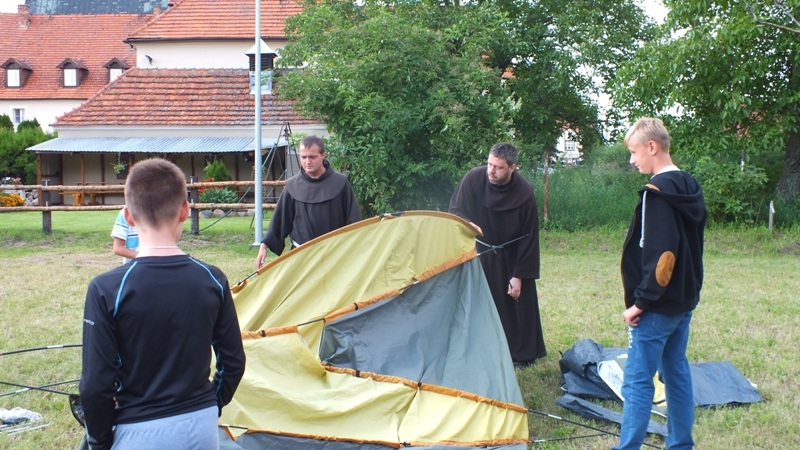 Spotkanie rozpoczęło się w środę o godz. 17 tej krótkim filmem o Św. Klarze a następnie wszyscy udali się do ogrodu gdzie Ojciec Masseo wraz z bratem Jozafatem czekali na swoich podopiecznych w przygotowanej kapliczce. Po słodkim podwieczorku i zakwaterowaniu w namiotach, dwie grupy udały się w teren aby odszukać ukryte koperty z zadaniami, które trzeba było wykonać. Po godzinie wszyscy wrócili do ogrodu, gdzie zostali rozliczeni z poleceń, które mieli wykonać. Gdy nadszedł wieczór zjedliśmy wspólnie kolację, grillowaną kiełbaskę, a potem wzięliśmy udział w turnieju wiedzy o Św. Klarze. Znajomość Świętej okazała się imponująca. Dzieci znają wiele faktów z życia Klary dzięki filmom, które obejrzeli i opowiadaniom Ojca Masseo. Po wieczornym apelu wszyscy udali się na spoczynek do namiotów. Gdy nadeszła północ, a chyba nikt jeszcze nie spał, razem z Ojcem Proboszczem, Ojcem Masseo i bratem Jozafatem, przy świetle pochodni i lampionów wyruszyliśmy w cichym marszu, ulicami naszego miasta w poszukiwaniu chleba. Było już po północy, gdy zapukaliśmy do drzwi jednego z domów, gdzie w oknach widać było jeszcze światło. Gdy trochę zdziwiony gospodarz otworzył nam drzwi poprosiliśmy go o chleb i wielka była nasza radość, gdy otrzymaliśmy świeży bochenek. Gorąco podziękowaliśmy i przeprosiliśmy za najście a następnie wróciliśmy do namiotów, aby tym razem już naprawdę pójść spać. Pobudka rano nie była już tak przyjemna, noc dla niektórych była bardzo krótka. Trochę niewyspani ale bardzo radośni, udaliśmy się do kościoła aby uczestniczyć we Mszy św. a następnie zjedliśmy pyszne śniadanie, po którym pozostało nam tylko zwinąć namioty i czekać do przyszłego roku, aby znowu wspólnie z Ojcami wspominać Św. Klarę.