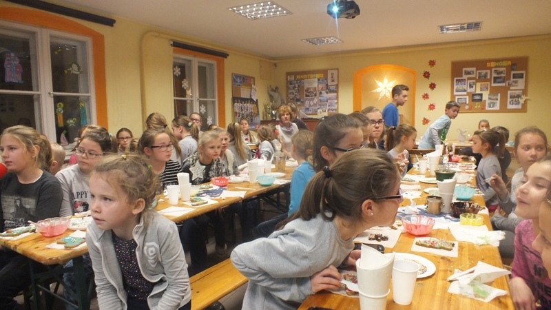 W piątek 2 grudnia, po roratach dzieci zostały zaproszone na ,, Przedświąteczne spotkanie z malowaniem pierników”. Chętnych na ,,słodkie zajęcia” było bardzo wielu. Sala św. Klary była w tym dniu pięknie przystrojona i wypełniona zapachem pierników. W świątecznej scenerii dzieci z obejrzały prezentację pt. ,, Boże Narodzenie”, która przybliżyła im istotę zbliżających się świąt, a także tradycje i zwyczaje świąteczne w różnych krajach na świecie. Następnie wszyscy przystąpili do malowania pierników czyli głównego punktu spotkania, na który dzieci czekały z wielką niecierpliwością. Na stołach przygotowano kolorowy lukier i posypki, którymi mali cukiernicy według własnych pomysłów dekorowali pierniki o różnych kształtach / renifery, aniołki, mikołaje, choinki, gwiazdki itp. /. Wszyscy wzięli się do pracy z dużym zaangażowaniem. Wspaniale radzili sobie z malowaniem ciasteczek, na których wyczarowali piękne, kolorowe wzory. Niektórzy ukradkiem podjadali pierniczki, posypkę lub zlizywali słodki lukier z palców. Zabawa podczas malowania była świetna, wszystkie dzieci napełniła pozytywną energią i radością. Ta twórcza praca wprowadziła już wszystkich w świąteczny nastrój. W związku z tym, że 6 grudnia wspominamy św. Mikołaja, dzieci śpiewały piosenki, które przygotowały na spotkanie ze Świętym. Każdy mógł zabrać do domu własnoręcznie udekorowane, kolorowe ciasteczka. Wykonane od serca lukrowane pierniczki mogą być wyjątkowym prezentem dla najbliższych lub piękną dekoracją stołu. Pachnące, kolorowe pierniczki, ich zapach nie kłamie- święta tuż, tuż.