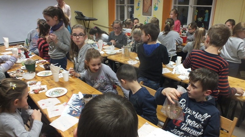 W piątek 2 grudnia, po roratach dzieci zostały zaproszone na ,, Przedświąteczne spotkanie z malowaniem pierników”. Chętnych na ,,słodkie zajęcia” było bardzo wielu. Sala św. Klary była w tym dniu pięknie przystrojona i wypełniona zapachem pierników. W świątecznej scenerii dzieci z obejrzały prezentację pt. ,, Boże Narodzenie”, która przybliżyła im istotę zbliżających się świąt, a także tradycje i zwyczaje świąteczne w różnych krajach na świecie. Następnie wszyscy przystąpili do malowania pierników czyli głównego punktu spotkania, na który dzieci czekały z wielką niecierpliwością. Na stołach przygotowano kolorowy lukier i posypki, którymi mali cukiernicy według własnych pomysłów dekorowali pierniki o różnych kształtach / renifery, aniołki, mikołaje, choinki, gwiazdki itp. /. Wszyscy wzięli się do pracy z dużym zaangażowaniem. Wspaniale radzili sobie z malowaniem ciasteczek, na których wyczarowali piękne, kolorowe wzory. Niektórzy ukradkiem podjadali pierniczki, posypkę lub zlizywali słodki lukier z palców. Zabawa podczas malowania była świetna, wszystkie dzieci napełniła pozytywną energią i radością. Ta twórcza praca wprowadziła już wszystkich w świąteczny nastrój. W związku z tym, że 6 grudnia wspominamy św. Mikołaja, dzieci śpiewały piosenki, które przygotowały na spotkanie ze Świętym. Każdy mógł zabrać do domu własnoręcznie udekorowane, kolorowe ciasteczka. Wykonane od serca lukrowane pierniczki mogą być wyjątkowym prezentem dla najbliższych lub piękną dekoracją stołu. Pachnące, kolorowe pierniczki, ich zapach nie kłamie- święta tuż, tuż.