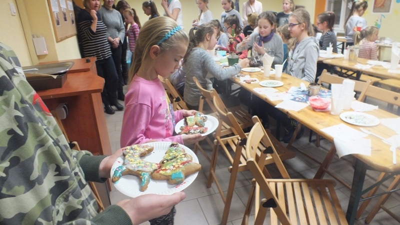 W piątek 2 grudnia, po roratach dzieci zostały zaproszone na ,, Przedświąteczne spotkanie z malowaniem pierników”. Chętnych na ,,słodkie zajęcia” było bardzo wielu. Sala św. Klary była w tym dniu pięknie przystrojona i wypełniona zapachem pierników. W świątecznej scenerii dzieci z obejrzały prezentację pt. ,, Boże Narodzenie”, która przybliżyła im istotę zbliżających się świąt, a także tradycje i zwyczaje świąteczne w różnych krajach na świecie. Następnie wszyscy przystąpili do malowania pierników czyli głównego punktu spotkania, na który dzieci czekały z wielką niecierpliwością. Na stołach przygotowano kolorowy lukier i posypki, którymi mali cukiernicy według własnych pomysłów dekorowali pierniki o różnych kształtach / renifery, aniołki, mikołaje, choinki, gwiazdki itp. /. Wszyscy wzięli się do pracy z dużym zaangażowaniem. Wspaniale radzili sobie z malowaniem ciasteczek, na których wyczarowali piękne, kolorowe wzory. Niektórzy ukradkiem podjadali pierniczki, posypkę lub zlizywali słodki lukier z palców. Zabawa podczas malowania była świetna, wszystkie dzieci napełniła pozytywną energią i radością. Ta twórcza praca wprowadziła już wszystkich w świąteczny nastrój. W związku z tym, że 6 grudnia wspominamy św. Mikołaja, dzieci śpiewały piosenki, które przygotowały na spotkanie ze Świętym. Każdy mógł zabrać do domu własnoręcznie udekorowane, kolorowe ciasteczka. Wykonane od serca lukrowane pierniczki mogą być wyjątkowym prezentem dla najbliższych lub piękną dekoracją stołu. Pachnące, kolorowe pierniczki, ich zapach nie kłamie- święta tuż, tuż.