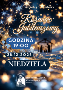 W przyszłą niedzielę 28.12 zapraszamy z jubileuszowymi różańcami na wspólną modlitwę o godz. 19.00. Po modlitwie odbędzie się śpiew przy świecami. Na zakończenie będzie można złożyć pisemne podziękowania przy figurze Matki Bożej.