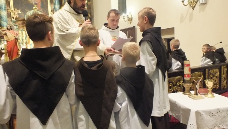 Z racji zbliżającego się liturgicznego wspomnienia św. Tarsycjusza, patrona ministrantów, w piątek, 4 listopada w naszej parafii przeżywaliśmy ministranckie święto. Obchody tej uroczystości rozpoczęły się Mszą św. o godz. 16.00. Została odprawiona w intencji naszych ministrantów oraz ich rodzin. Podczas Eucharystii wszyscy ministranci odnowili swoje przyrzeczenia Liturgicznej Służby Ołtarza. Siedmiu kandydatów oficjalnie rozpoczęło okres próby, a dwóch starszych kandydatów otrzymało kaptury i tym samym stali się ministrantami choralistami. Pozostali ministranci, po wcześniejszym przygotowaniu i egzaminie, otrzymali nowe posługi Liturgicznej Służby Ołtarza: ministranta światła, krzyża, księgi, ołtarza a także posługę lektora. Szczególną chwilą tej Uroczystości był moment, kiedy rodzice ministrantów wyrazili zgodę na służbę swoich synów w Liturgicznej Służbie Ołtarza. Po zakończonej Mszy św. w refektarzu klasztornym odbyła się wspólna agapa tzn. słodki poczęstunek.