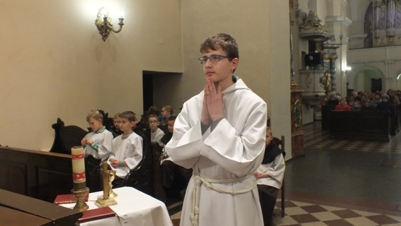 Z racji zbliżającego się liturgicznego wspomnienia św. Tarsycjusza, patrona ministrantów, w piątek, 4 listopada w naszej parafii przeżywaliśmy ministranckie święto. Obchody tej uroczystości rozpoczęły się Mszą św. o godz. 16.00. Została odprawiona w intencji naszych ministrantów oraz ich rodzin. Podczas Eucharystii wszyscy ministranci odnowili swoje przyrzeczenia Liturgicznej Służby Ołtarza. Siedmiu kandydatów oficjalnie rozpoczęło okres próby, a dwóch starszych kandydatów otrzymało kaptury i tym samym stali się ministrantami choralistami. Pozostali ministranci, po wcześniejszym przygotowaniu i egzaminie, otrzymali nowe posługi Liturgicznej Służby Ołtarza: ministranta światła, krzyża, księgi, ołtarza a także posługę lektora. Szczególną chwilą tej Uroczystości był moment, kiedy rodzice ministrantów wyrazili zgodę na służbę swoich synów w Liturgicznej Służbie Ołtarza. Po zakończonej Mszy św. w refektarzu klasztornym odbyła się wspólna agapa tzn. słodki poczęstunek.