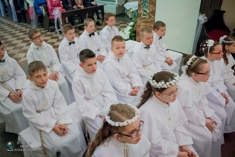 Dzieci z wielkim zaangażowaniem i przejęciem uczestniczyły we Mszy św., którą celebrował ojciec proboszcz Ksawery Majewski. Na zakończenie Eucharystii dzieci podziękowały: Panu Jezusowi, za to, że zamieszkał w ich sercach, rodzicom za ich miłość, ojcu Ksaweremu za przygotowanie do tej Uroczystości. Następnie dzieci z rąk ojca proboszcza otrzymały chleby, jako wezwanie, aby i one stawały się dobre jak chleb i zawsze miały kochające serca. Po zrobieniu wspólnego zdjęcia otrzymały wydanie specjalne „Franusia Informatorka”, w którym znajdowały się zdjęcia dzieci z Franusiem i Klarusią. Dzieciom życzymy, aby zawsze kroczyły drogą Bożej miłości i aby były pełne radości, iż odtąd będą mogły przyjmować Chrystusa obecnego w Najświętszym Sakramencie. Dziękujemy także wszystkim, którzy byli zaangażowani w przygotowanie i przebieg uroczystości Pierwszej Komunii Świętej.