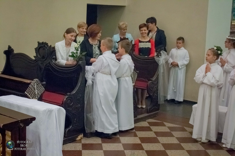 Dzieci z wielkim zaangażowaniem i przejęciem uczestniczyły we Mszy św., którą celebrował ojciec proboszcz Ksawery Majewski. Na zakończenie Eucharystii dzieci podziękowały: Panu Jezusowi, za to, że zamieszkał w ich sercach, rodzicom za ich miłość, ojcu Ksaweremu za przygotowanie do tej Uroczystości. Następnie dzieci z rąk ojca proboszcza otrzymały chleby, jako wezwanie, aby i one stawały się dobre jak chleb i zawsze miały kochające serca. Po zrobieniu wspólnego zdjęcia otrzymały wydanie specjalne „Franusia Informatorka”, w którym znajdowały się zdjęcia dzieci z Franusiem i Klarusią. Dzieciom życzymy, aby zawsze kroczyły drogą Bożej miłości i aby były pełne radości, iż odtąd będą mogły przyjmować Chrystusa obecnego w Najświętszym Sakramencie. Dziękujemy także wszystkim, którzy byli zaangażowani w przygotowanie i przebieg uroczystości Pierwszej Komunii Świętej.