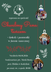 Zespół Tańca Ludowego Swojacy z gminy Raszków k/ Ostrowa Wielkopolskiego zaprezentuje niecodzienny spektakl : Kolędy i pastorałki w formie tanecznej pn. „Tańcem chwalmy Pana”. Będzie to widowisko muzyczno – taneczne wykonane przez około 50 osobową grupę dzieci i młodzieży ukazujących w śpiewie, tańcu i stroju piękno naszego polskiego folkloru.